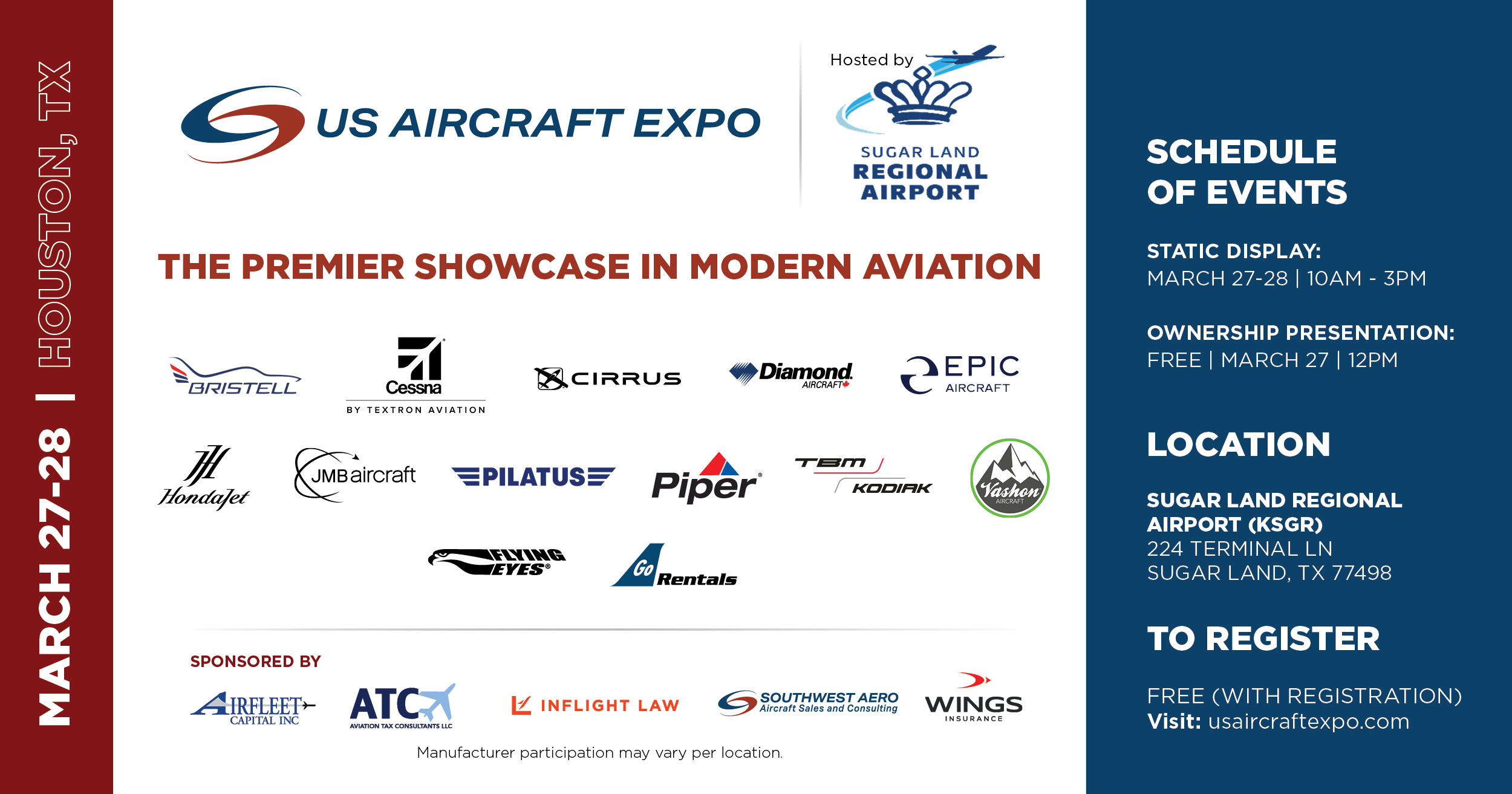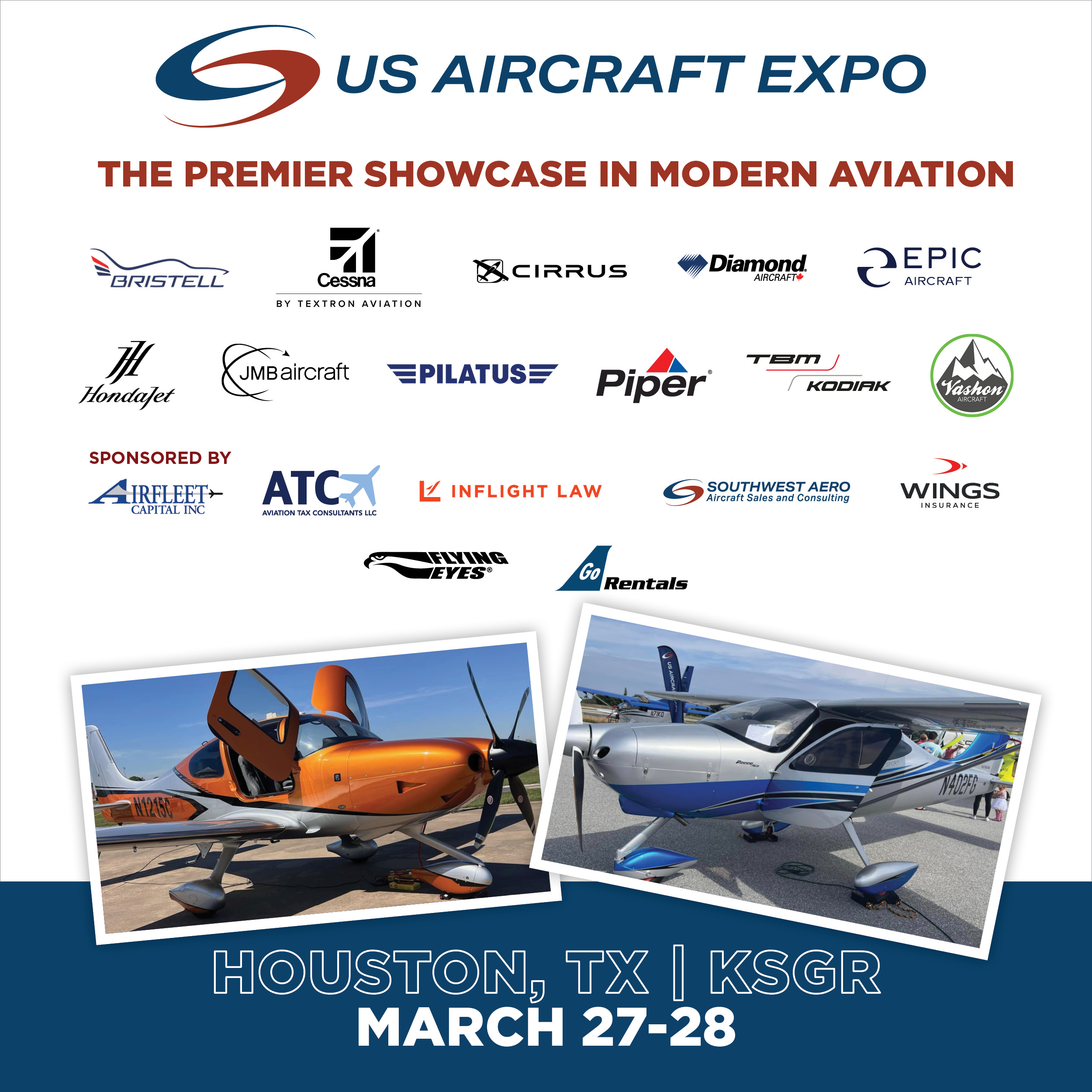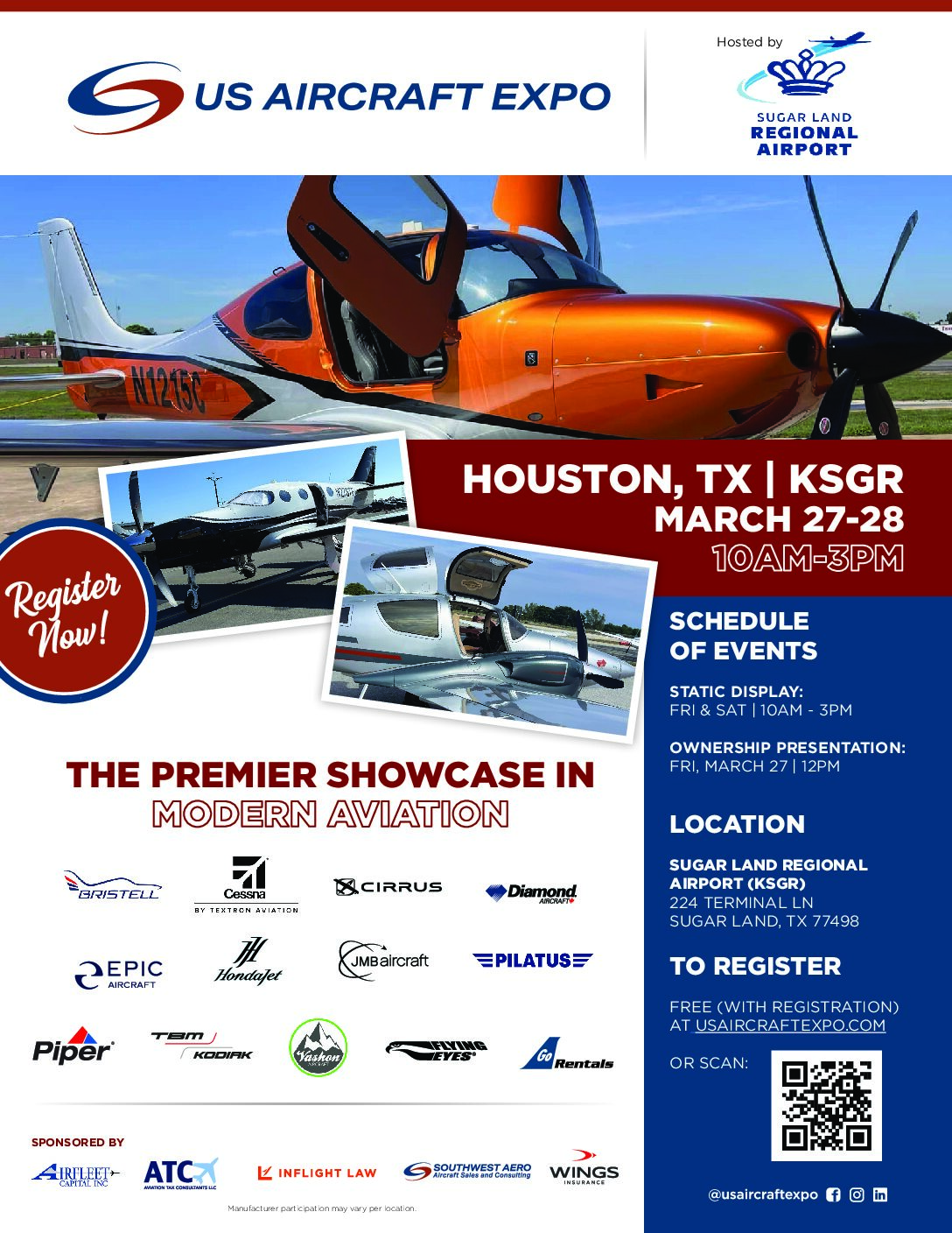 - DAY ONE – FRIDAY: Day one at @USAIRCRAFTEXPO in Houston, TX (KSGR) is in progress. Don’t miss our showcase of aircraft on display from 10 a.m. – 3 p.m. today and tomorrow.